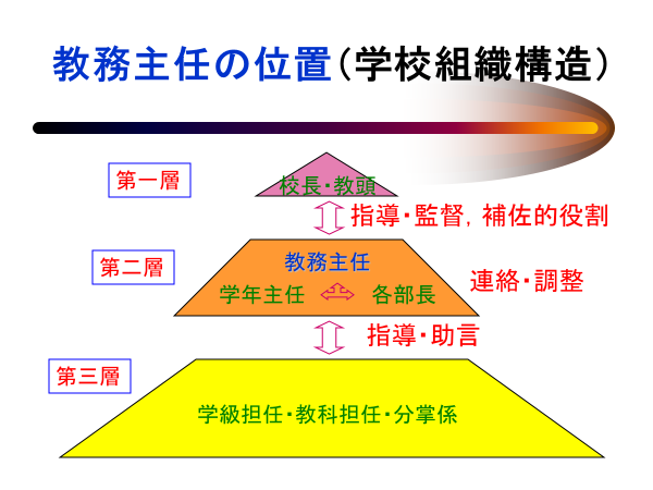教務主任は、第一層に対して、指導・監督を受ける。補佐的役割をする「上昇コミュニケーション」、第二層に対して、連絡・調整をする「水平コミュニケーション」、第三層に対して、指導・助言をする「下降コミュニケーション」が要求されます。