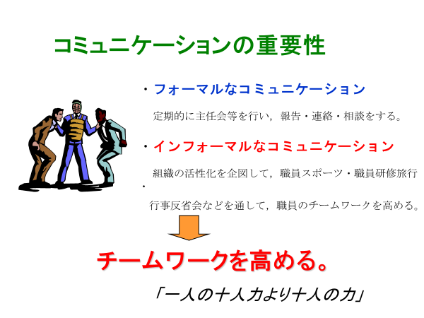 学校においても、目標に向けてベクトルを共有し、共通理解を図りながら、きょうどう意識を高め、フォーマル・インフォーマルともにコミュニケーションを大事にすることが必要です。