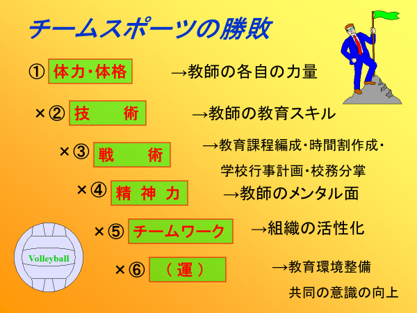 掛け算の性質上、これらの要素のうち、ひとつでも「ゼロ」であると全体としての成果が「ゼロ」になります。バレーボールで例をあげると、いかに個々の体力・体格に優れ、スパイクやサーブの技術が高く、戦術や精神力に問題がなくても、チームワークが「ゼロ」だと、ゲームで勝利をおさめることはできないというわけです。逆にチームワークのいいチームは、2倍、3倍ものパフォーマンスを発揮できます。それぞれの要素の足し算(和)ではないところがみそです。