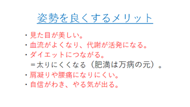 よい姿勢は病気やけがの防止につながるだけでなく、自信が沸き、やる気が出ます。実は、成績向上の秘訣なのです。