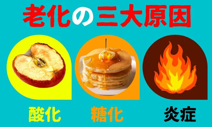 老化の原因は、①酸化、②糖化、③慢性炎症です。