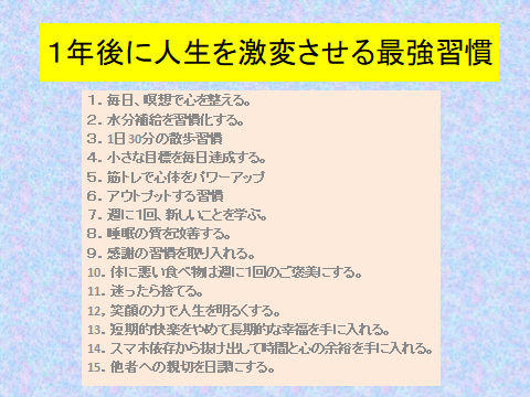 虹は自分で作ろう。~幸せや幸運は自分で手に入れよう~7月16日は「虹の日」。偶然、虹を見ることが出来ると、私は「運がいい!」とか「幸せだなあ!」と思います。 しかし、偶然に頼らなくても、虹を見ることは可能です。自分で虹を作って、「運がいい!」、「幸せだなあ!」と思うようにすればいいのです。 朝方や夕方にホースで霧状に水巻きをすれば、誰でも簡単に虹を作ることができます。 また、水で満たしたペットボトルに懐中電灯の光をあてると、虹を作ることが出来ます。 さらに、暗い室内の中で、CDに懐中電灯を当ててみると虹が出来ます。 幸せがくるのを待つのではなく、自分から虹を作って幸せを手にしましょう。  ところで、日本では虹は7色が常識とされていますが。海外では違うようです。アメリカやイギリスでは一般的に6色と言われており、ドイツでは5色、台湾のブヌン族では3色、南アジアのバイガ族では赤と黒の2色だそうです。                                                                                                                                                                                                                                                       運命には、「天命」(宿命)と「立命」があります。同じように、運にも「天運」と「地運」があります。「地運」より「天運」の方が重要です。運がいいかどうかは、自分次第だということです。 植西 聰さんの「運」のいい人の習慣術を紹介しましょう。...