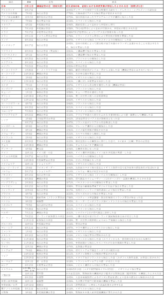 さて、世界の建国日をみると「独立日」「統一日」「革命日」「憲法を制定した日」「政府の樹立日」などが、建国日にあたるでしょう。