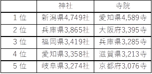 県別に神社と寺院の上位ベスト5をあげると次のようになります。