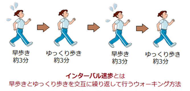 ゆっくりとした歩きと早歩きを3 ~ 5 分おきに交互に行うインターバルウォーキングがおススメです。