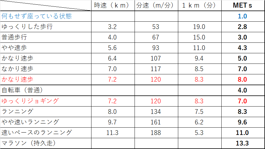 安静時の酸素摂取量3.5ml/kg/分を1とし、その運動で何倍のエネルギーを消費できたかで運動強度を示した単位をメッツとして表します。