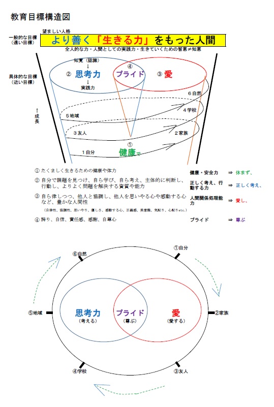 その際、学校経営方針を構造図にして示すこととわかりよいと思います。ただ単に、文章を座列しただけの教育目標など、誰の頭に入るでしょうか?