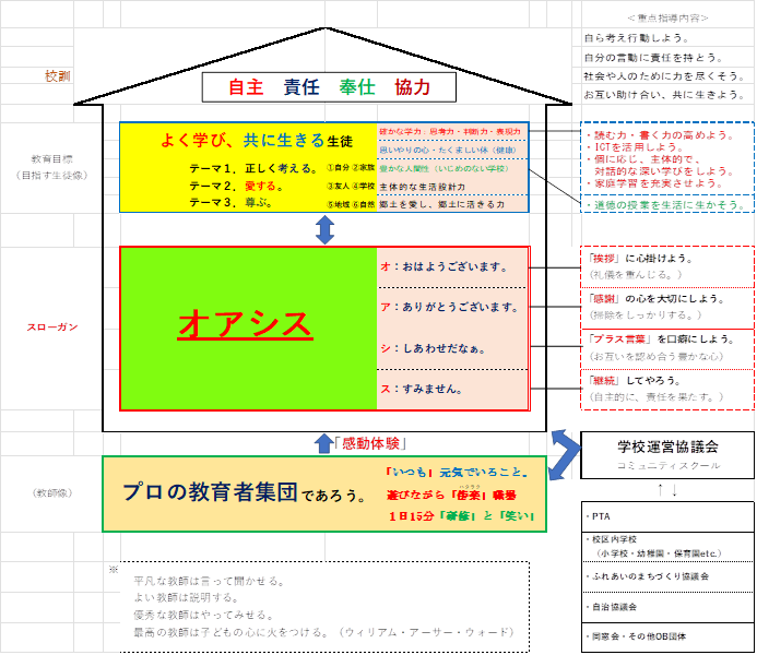 この図は、学校をひとつの「家」に譬え、屋根に当たる部分に校訓、梁に当たる部分に教育目標(目指す生徒像)、柱に当たる部分にスローガン、そして、土台に当たる部分に教師像が記されています。図表化することで、学校運営協議会やPTAなどの位置づけや、これに対応した重点指導内容がよく分かります。